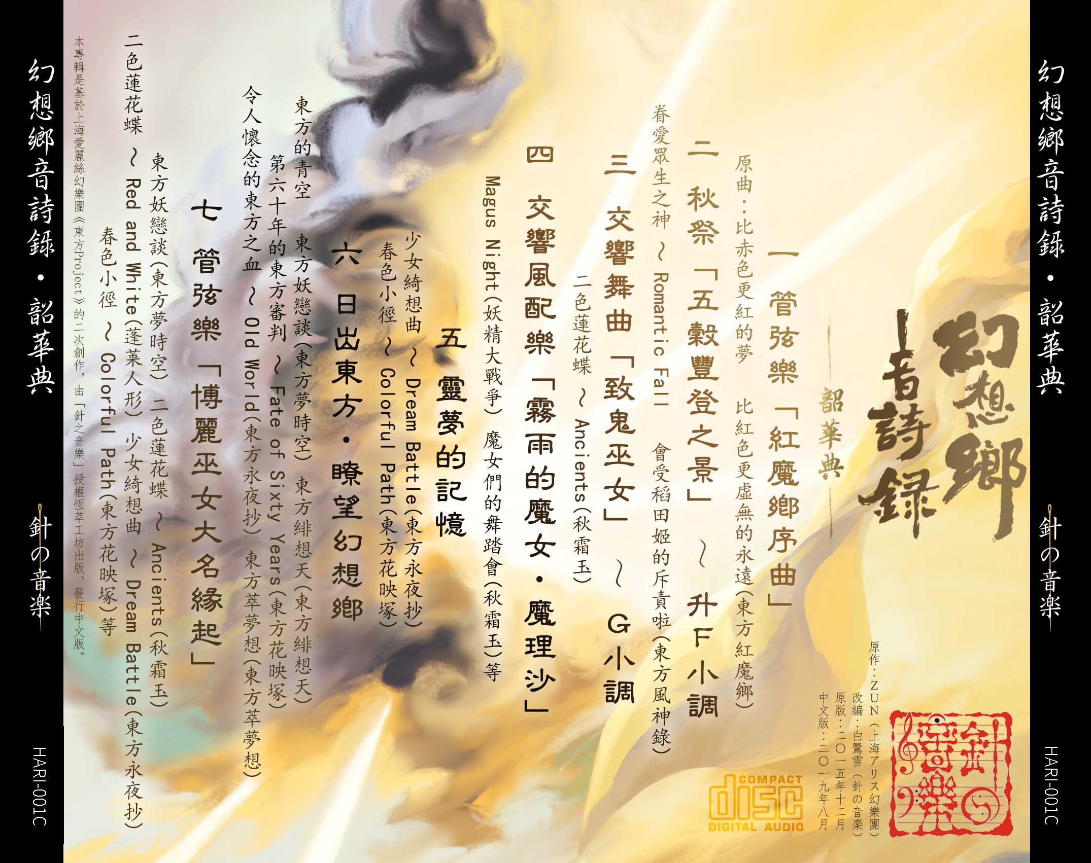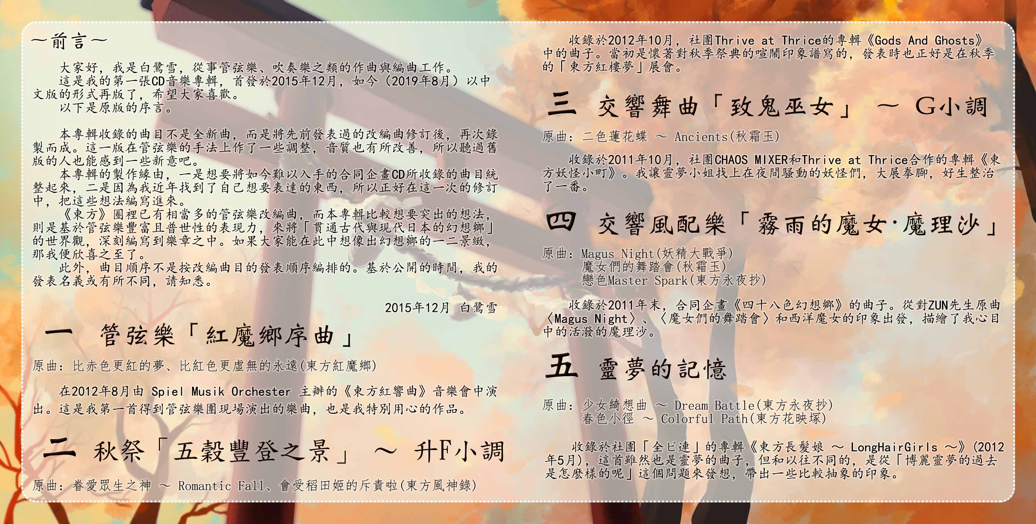現在,我們正式將他的專輯引進中國,翻譯小冊內文,並委由畫師霧川彌歌為之重新設計封面與小冊。首批作品為他的前兩張專輯《幻想郷音詩録 管弦楽のしらべ》《幻想郷音詩録 吹奏楽のしらべ》,我們中文版分別重新命名為《幻想鄉音詩錄‧韶華典》和《幻想鄉音詩錄‧萬籥集》。